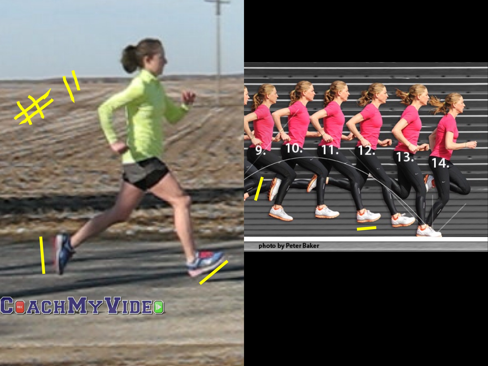 When your hips and legs aren’t on the same page, that’s when heel striking is at its worst. From a bird’s eye view, Dawn’s hips are behind her plant foot. This alone creates the heel striking. To work on this problem, I strongly suggest doing lots of core work (planks, etc) to strengthen your hips, glutes, and midsection. This will keep your core tight, but also allow your hip flexors to pull your legs through at the same rate of speed that your hips are moving.